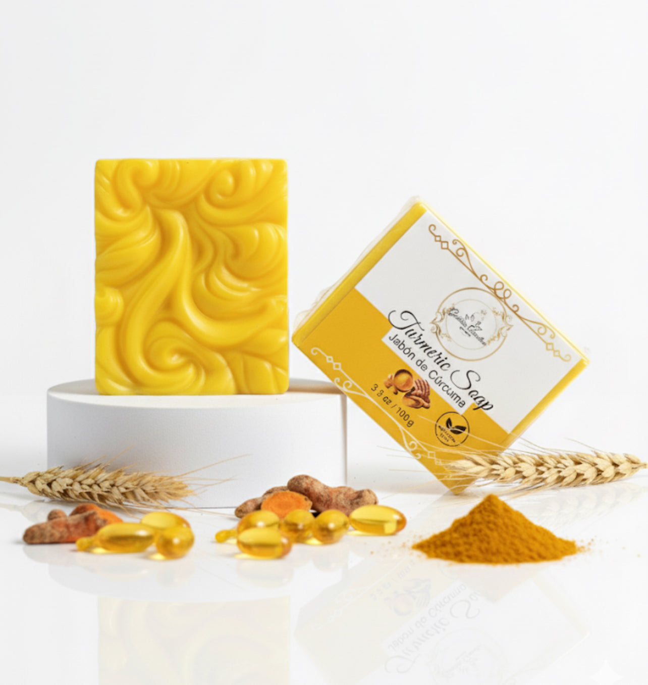 Este jabón está infusionado con cúrcuma, vitamina E, miel 100% natural y una nutritiva mezcla de aceites y esencias.